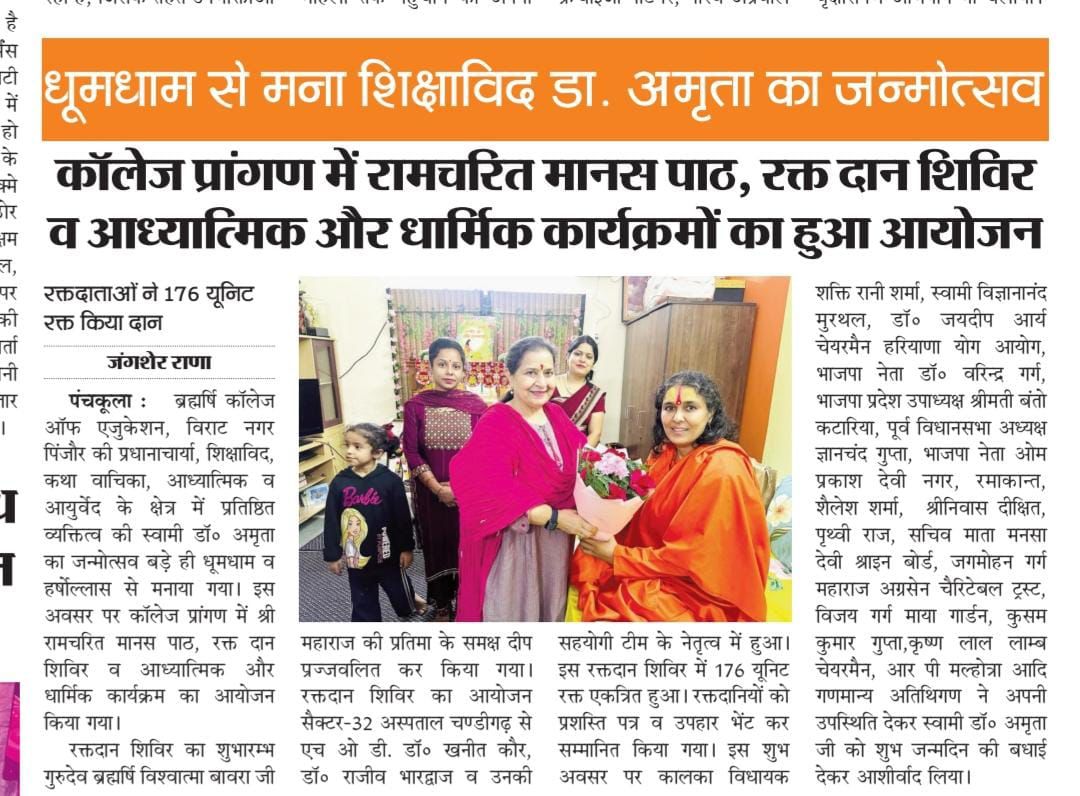Swami Dr. Amrita is a Sanyasi, Hindu educationist, social worker and spiritual yoga master. Sheis known for her work in the field of women empowerment through education in rural India and providing free residential education to needy rural deserving boys since1998, for which she has been awarded various state and public honors from time to time. She is Chairperson of Brahmrishi College of Education and Administrator of Sri Ram Nanda Brahmrishi Sanskrit College and Manages Vishva Shiksha Niketan Hostel (Free of Cost). She is particularly known for her narration and oration of Sri Ram Katha and Srimad Bhagwad Katha in India. She has also worked for adolescent criminals in jails of India and taught them yoga and meditation processes for their overall betterment.