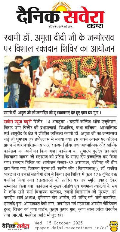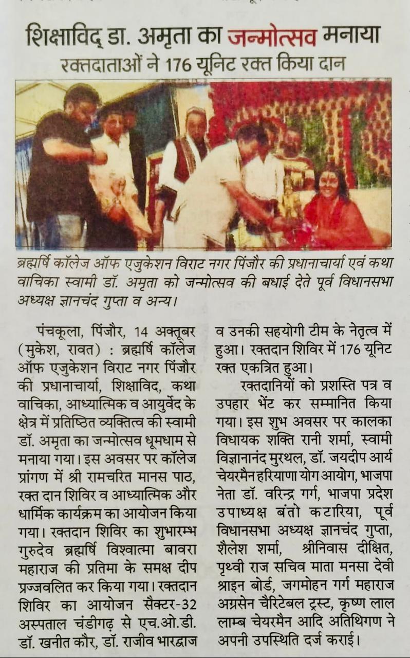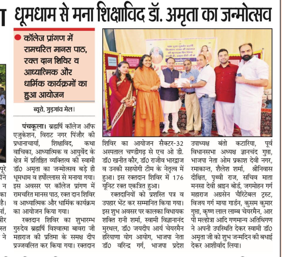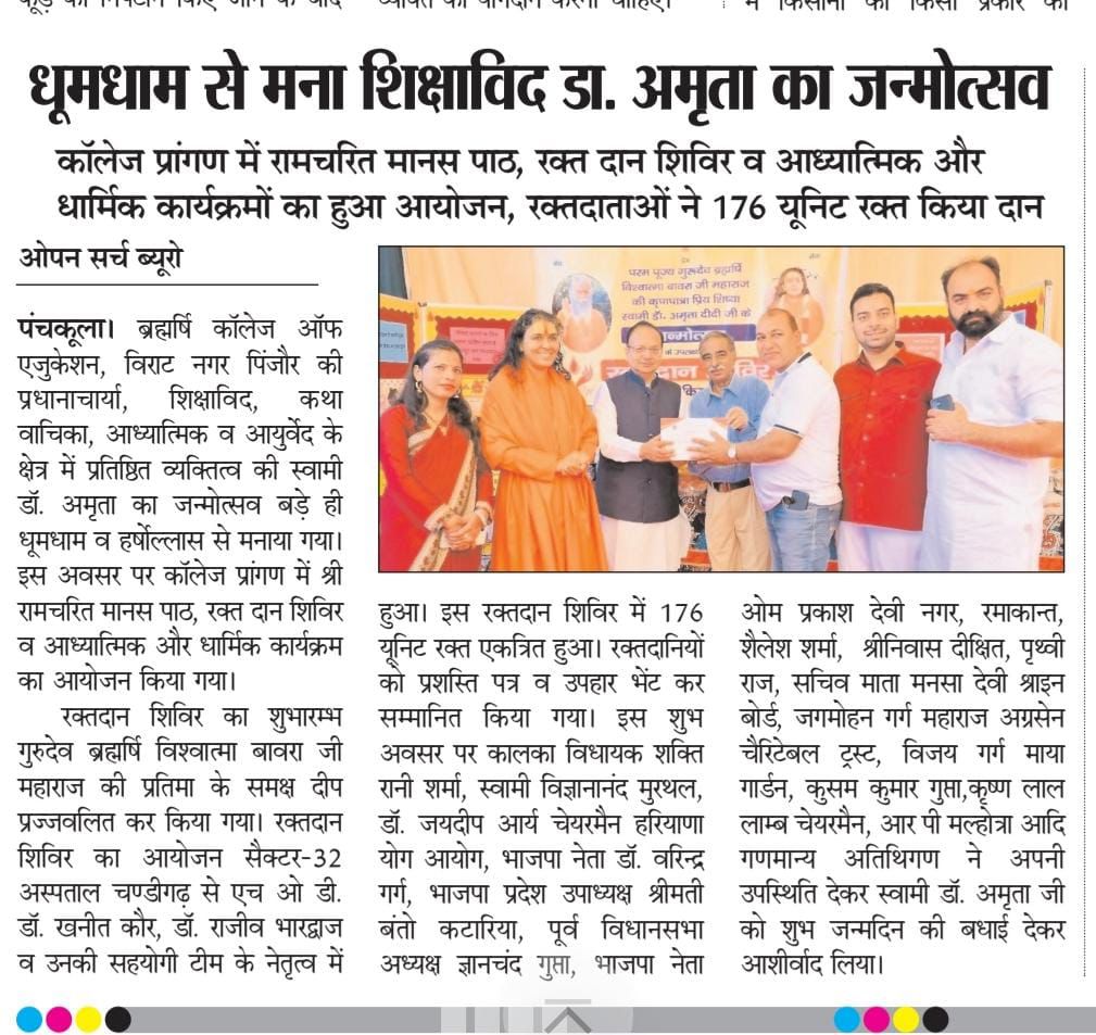 Swami Dr. Amrita ji is a spiritually enlightened person who has left no stone unturned in the field of female empowerment through literacy and education. Being a main disciple of His Holiness Brahmrishi Vishwatma Bawra ji Maharaj, she is a philosophic orator of Sri RamKatha, SrimadBhagwad Katha and an ordent follower ofSrimad Bhagwad Gita. Well connected to numerous social organisations, she is continually giving her words as lectures on multiple topics related to social upliftment and betterment of whole society at large.
